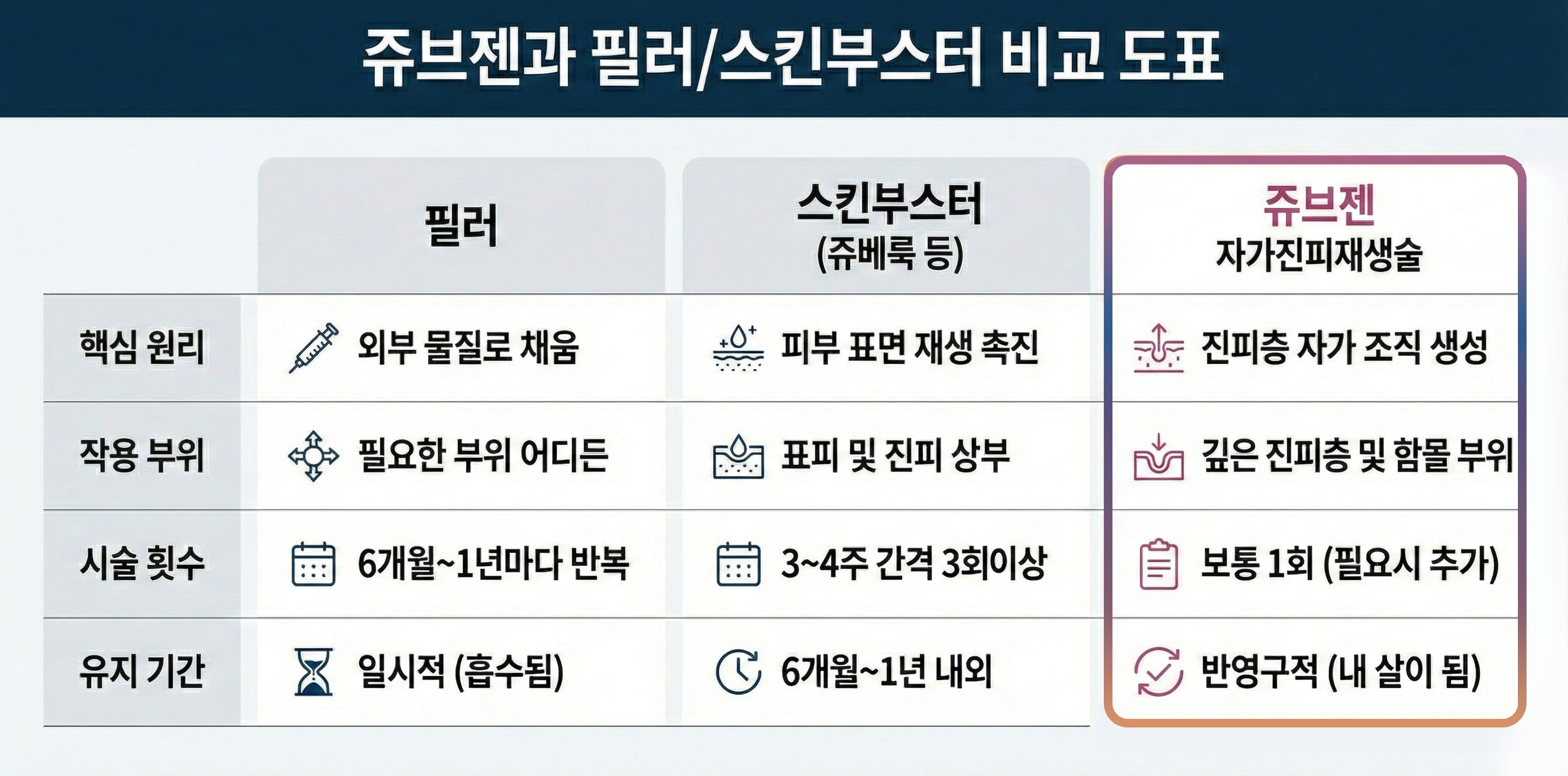 기존 시술들과 쥬브젠의 차이를 명확히 구분해야 합니다.