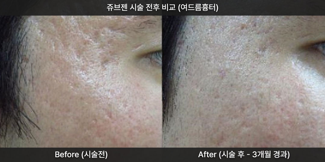 쥬브젠 자가진피재생술: 깊은 함몰 부위의 '진피층 자체'에 새살이 생기도록 유도합니다. 보통 1회 시술로도 효과를 기대할 수 있고, 생성된 콜라겐은 자연적인 노화에 의해 아주 서서히 흡수되어 효과가 오래 지속됩니다.